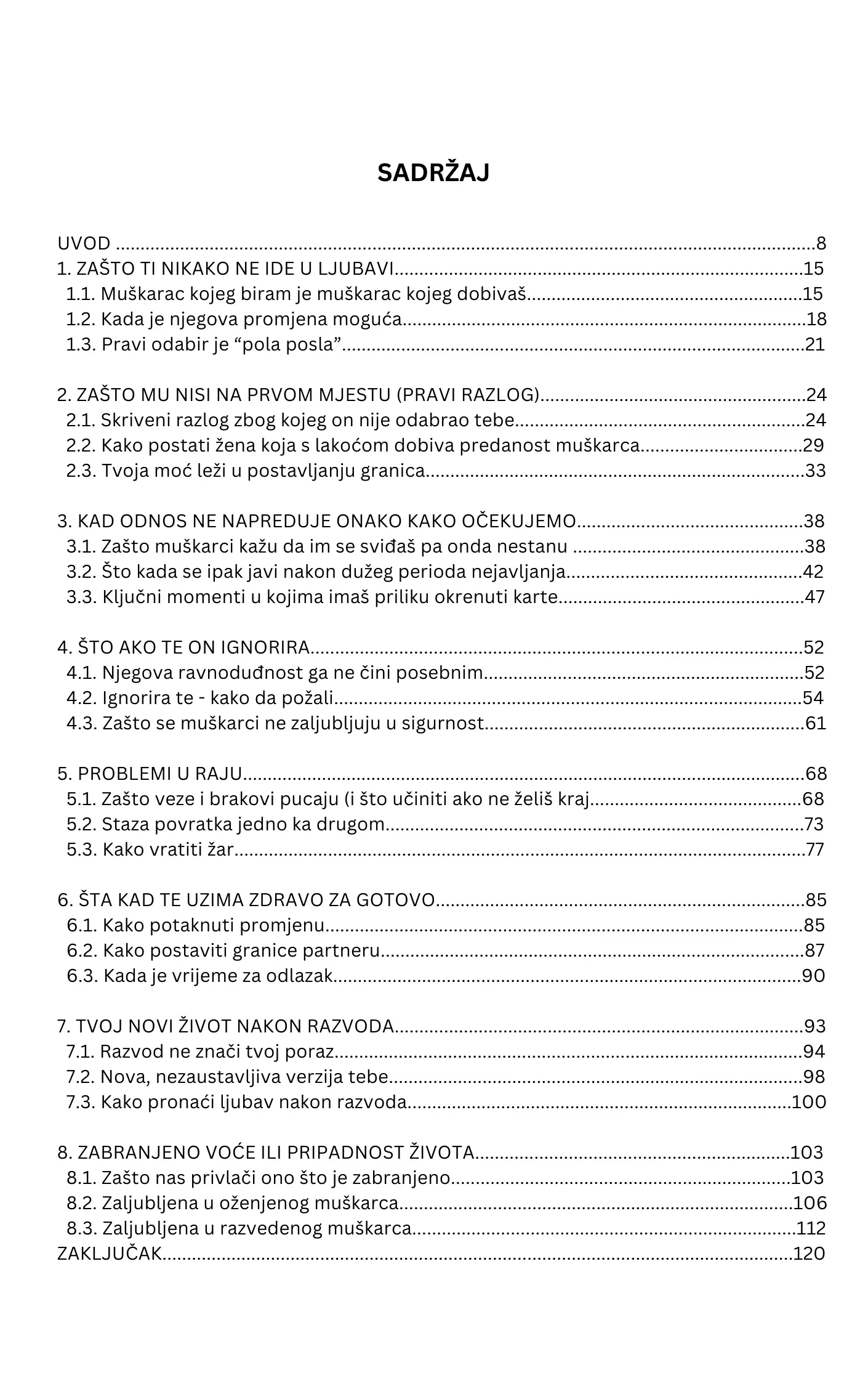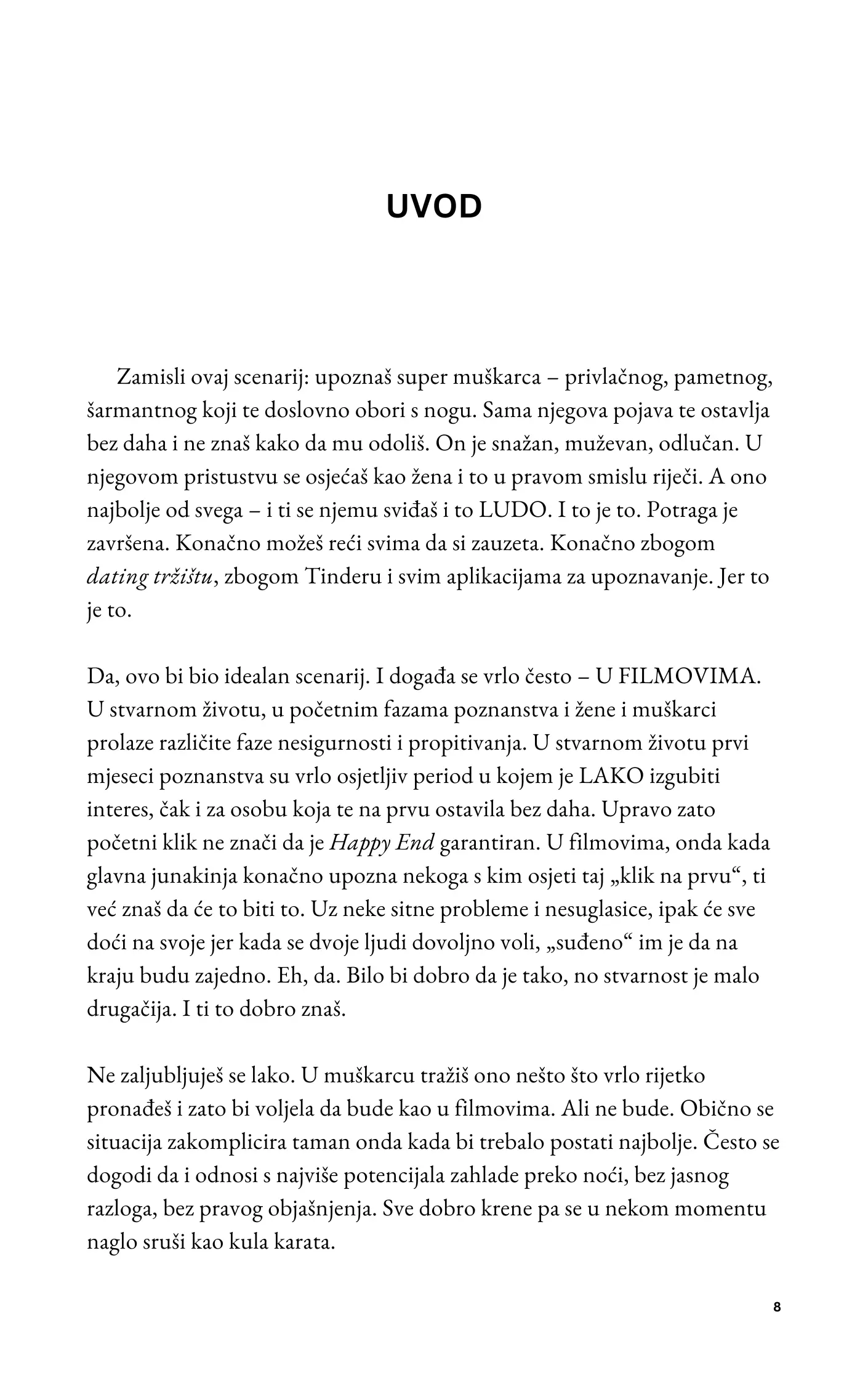 Odgovore na ova i brojna druga pitanja, pronaći ćete u ovoj knjizi koja će vam otvoriti oči i pokazati pametniji pristup kojim ćete puno lakše doći do ljubavnog odnosa kakav želite. Bez obzira na vaš trenutačni status i ljubavnu situaciju, nakon što je pročitate i primijenite naučeno, ova će knjiga biti pokretač vašeg velikog ljubavnog preokreta – očekuju vas ZAPANJUJUĆI REZULTATI.
